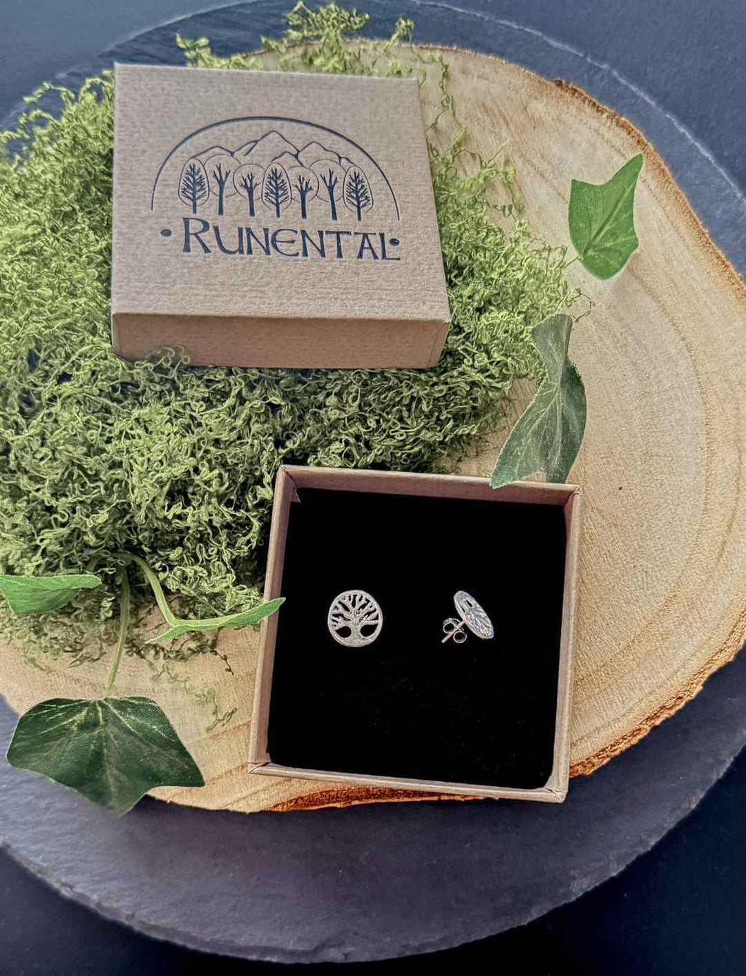 Roots of Eternity – Lebensbaum Ohrstecker aus 925er Silber in naturinspirierter Schmuckbox auf Holz und Moos-Untergrund, präsentiert von Runental.de